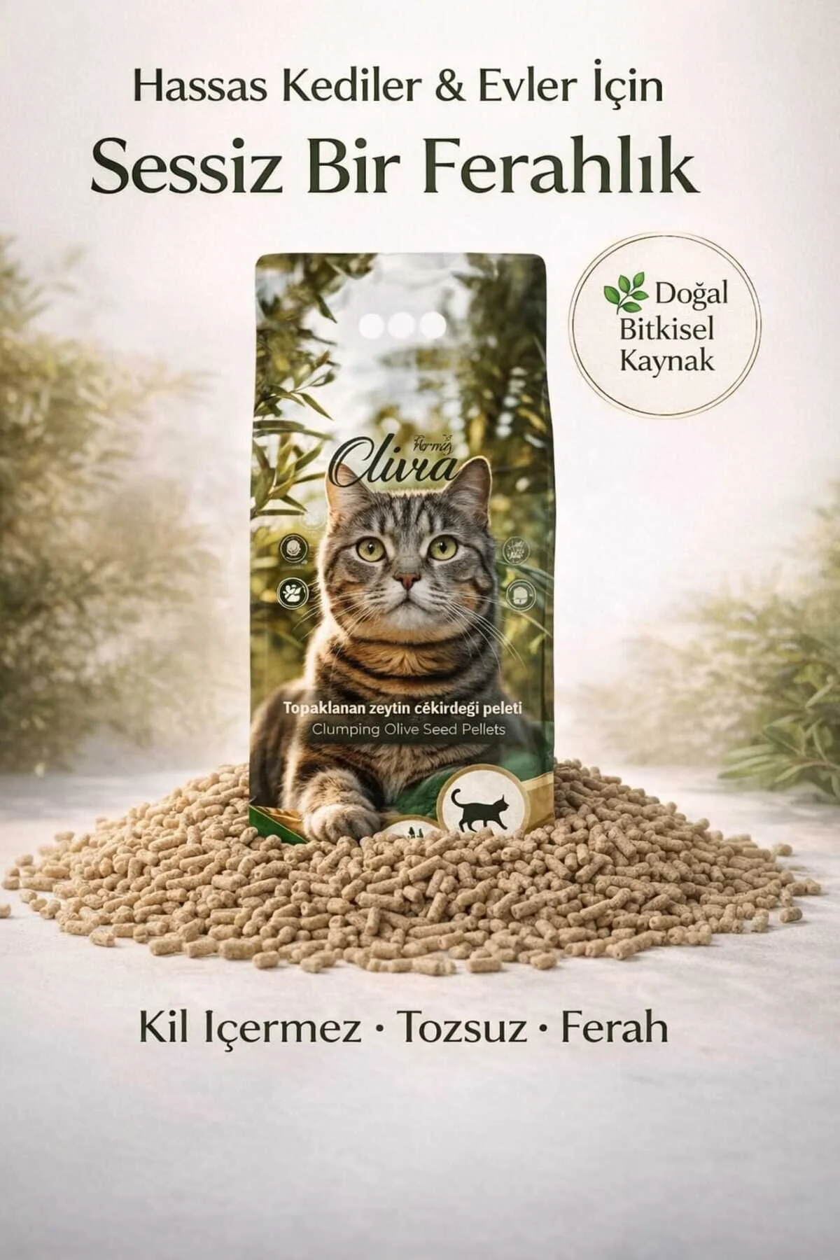 Kullanım Bilgisi * Kum kabına 5–7 cm kalınlığında dökün * Günlük olarak topaklanan kısmı temizleyin * İlk kullanımda kedinizin alışması için az miktar eski kumla karıştırabilirsiniz Ürün Özellikleri ✔ %100 doğal zeytin çekirdeği peleti ✔ Kimyasal katkı içermez ✔ Tozsuz yapı ✔ Yüksek emiş gücü ✔ Koku kontrolü sağlar ✔ Patilere yapışmaz ✔ Çevre dostu, doğada çözünebilir Kullanımda Dikkat Edilmesi Gerekenler * Klozete atılmaz.